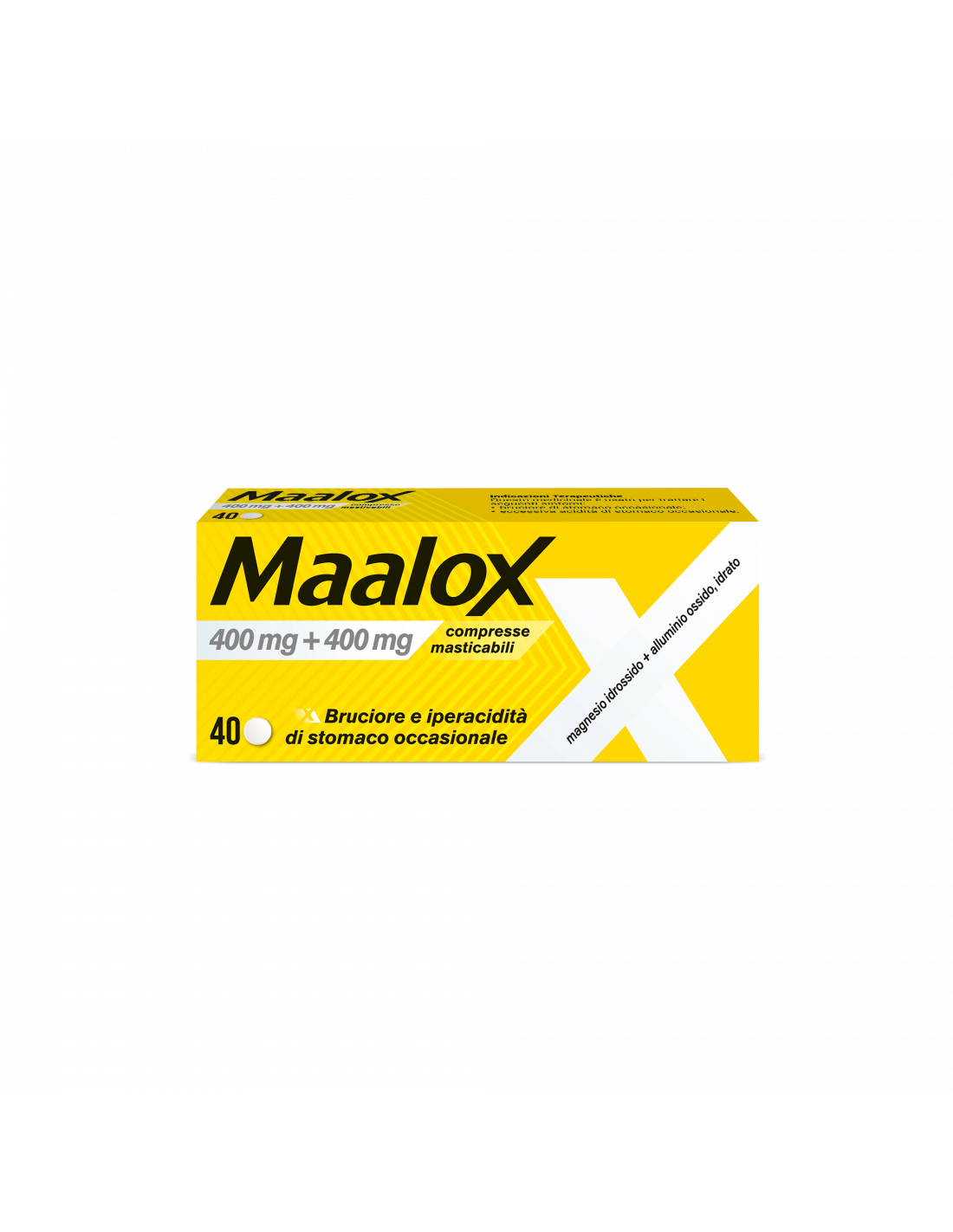 L’alluminio idrossido può causare stitichezza e un sovradosaggio di sali di magnesio può causare ipomotilità dell’intestino; alte dosi di questo medicinale possono causare o aggravare l’ostruzione intestinale e dell’ileo nei pazienti a più alto rischio, come quelli con compromissione renale, con stipsi di base, con alterazione della motilità intestinale, in bambini (da 0 a 24 mesi), o anziani. L’alluminio idrossido non è ben assorbito dal tratto gastrointestinale, e gli effetti sistemici sono quindi rari in pazienti con una normale funzionalità renale. Tuttavia, dosi eccessive o uso a lungo termine, o anche dosi normali in pazienti con diete povere di fosforo o in bambini (da 0 a 24 mesi), possono portare ad eliminazione del fosfato (a causa di un legame alluminio-fosfato) accompagnata da un aumento del riassorbimento osseo e ipercalciuria con rischio di osteomalacia. Si consiglia di consultare il medico nel caso di un uso a lungo termine o in pazienti a rischio di ipofosfatemia. Nei pazienti con compromissione renale i livelli plasmatici di alluminio e magnesio tendono ad aumentare causando rispettivamente iperalluminemia e ipermagnesiemia. In questi pazienti, lunghe esposizioni ad alte dosi di sali di alluminio e magnesio possono condurre a encefalopatie, demenza, anemia microcitica o al peggioramento di osteomalacia da dialisi. In presenza di forme lievi e moderate di insufficienza renale si consiglia di assumere il prodotto sotto il diretto controllo del medico. In questi pazienti deve essere evitato l’uso prolungato del medicinale. L’alluminio idrossido potrebbe non essere sicuro in pazienti affetti da porfiria sottoposti ad emodialisi (vedere paragrafo 4.3). Popolazione pediatrica Nei bambini piccoli l’uso di magnesio idrossido può portare a ipermagnesemia, in particolare se presentano danno renale o disidratazione. MAALOX 3,65% + 3,25% sospensione orale contiene: • paraidrossibenzoati: possono causare reazioni allergiche (anche ritardate). • circa 98 mg di so rbitolo in 10 ml (2 cucchiaini). Ai pazienti con intolleranza ereditaria al fruttosio non deve essere somministrato questo medicinale. • meno di 1 mmol (23 mg) di sodio per dose, cioè è essenzialmente “senza sodio”. MAALOX 400 mg + 400 mg compresse masticabili contiene: • circa 125 mg di sorbitolo per compressa. Ai pazienti con intolleranza ereditaria al fruttosio non deve essere somministrato questo medicinale. • Saccarosio, i pazienti affetti da rari problemi ereditari di intolleranza al fruttosio, da malassorbimento di glucosio-galattosio, o da insufficienza di sucrasi isomaltasi, non devono assumere questo medicinale. • meno di 1 mmol (23 mg) di sodio per dose, cioè è essenzialmente “senza sodio”. • 0.000072 mg di alcol benzilico per compressa. Alcol benzilico può causare reazioni allergiche. • Grandi volumi devono essere usati con cautela e solo se necessario, durante la gravidanza e l’allattamento e in pazienti con insufficienza epatica o renale, a causa del rischio di accumulo e tossicità (acidosi metabolica).