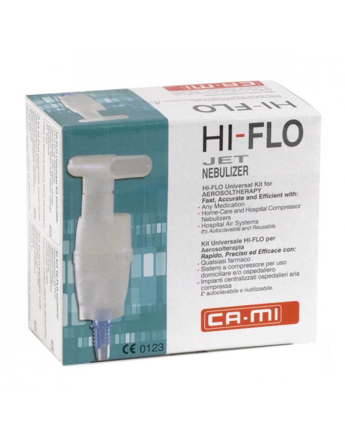 Nebulizzatore riutilizzabile ad alta efficienza, compatibile con la maggior parte dei compressori disponibili sul mercato e con i sistemi centralizzati ospedalieri ad aria compressa ed efficace con qualsiasi tipo di farmaco. HI-FLO è veloce grazie al "secondo effetto Venturi" che per mezzo dell'apertura laterale convoglia dall'esterno aria aggiuntiva all'interno del nebulizzatore, aumentando così l'attività di nebulizzazione e il conseguente flusso verso il paziente. Il volume residuo è ridotto al minimo grazie al particolare materiale impiegato nelle pareti interne del nebulizzatore che lascia scivolare le particelle verso il basso per essere ri-nebulizzate. HI-FLO è sterilizzabile per bollitura.
