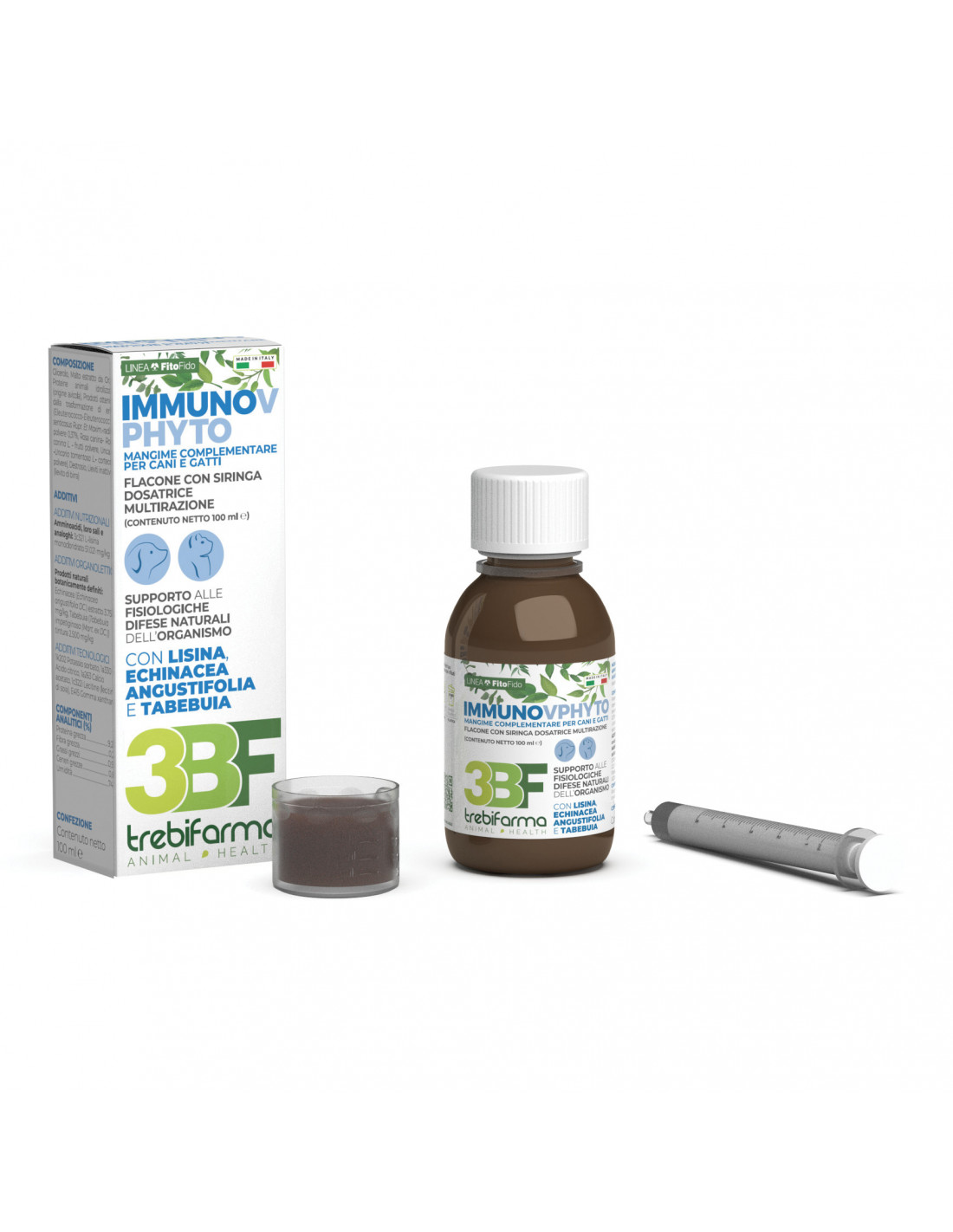 Utilizzare l'apposita siringa o il misurino dosatore per prelevare la razione giornaliera indicata, somministrare IMMUNOV PHYTO direttamente in bocca all'animale o in aggiunta al pasto principale. Completare la razione giornaliera con l'alimento abituale. Lasciare sempre acqua fresca a disposizione.