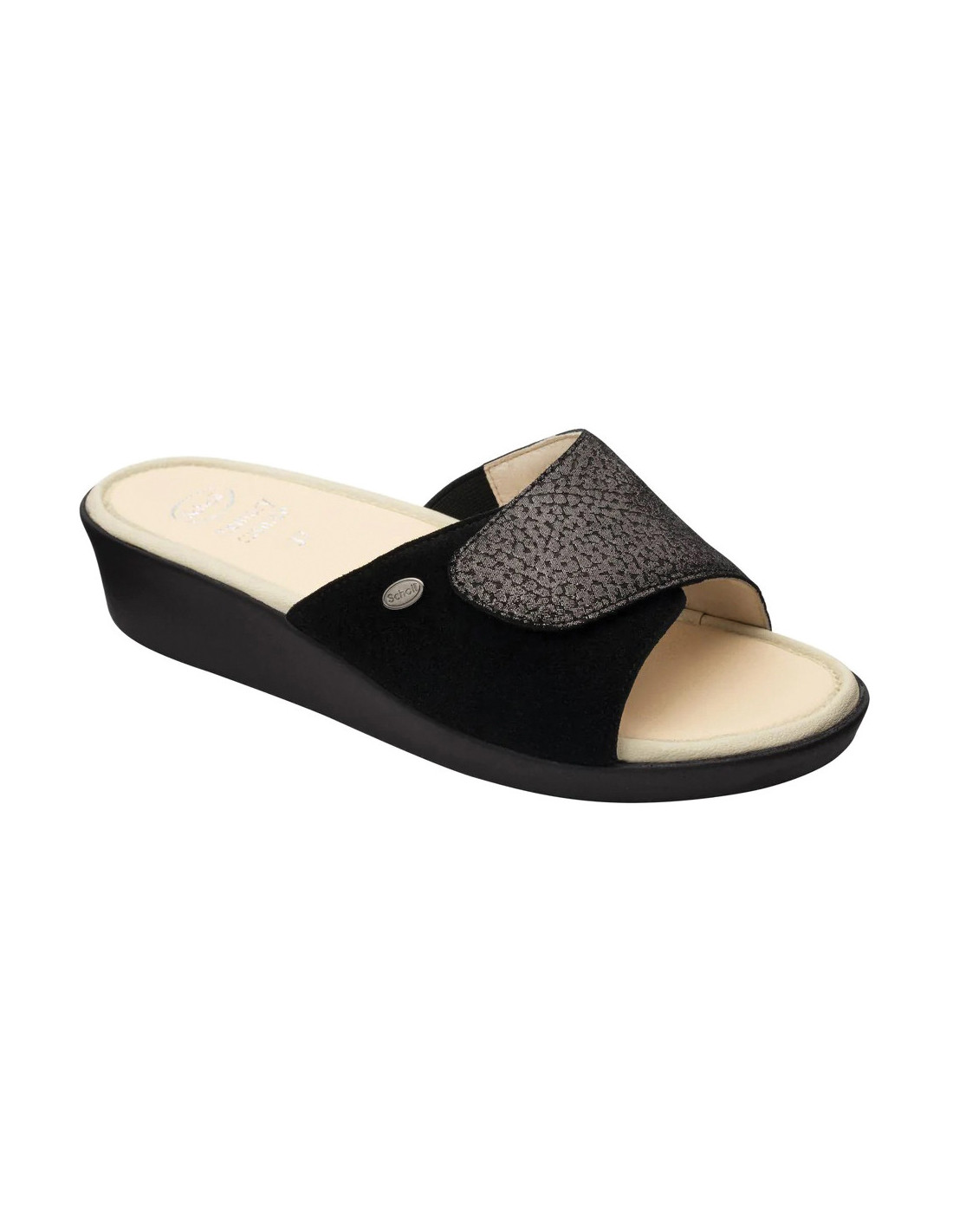 Ciabatta con tecnologia Scholl Memory Cushion ideale per stare in piedi comodamente tutta la giornata. La chiusura a velcro consente la massima adattabilità dello stile, mentre la comoda zeppetta resistente allo scivolamente assicura stabilità e comfort. La tomaia è impreziosita dalla lucentezza degli strass. Il plantare è inoltre rivestito con una microfibra lavabile, traspirante, anti-odore, ipollergenica e anti-macchia. Inoltre il plantare con tecnologia Scholl Memory Cushion si adatta all'anatomia del piede ed aiuta a ridistribuire la pressione esercitata su tutta la pianta donando una sensazione di leggerezza.