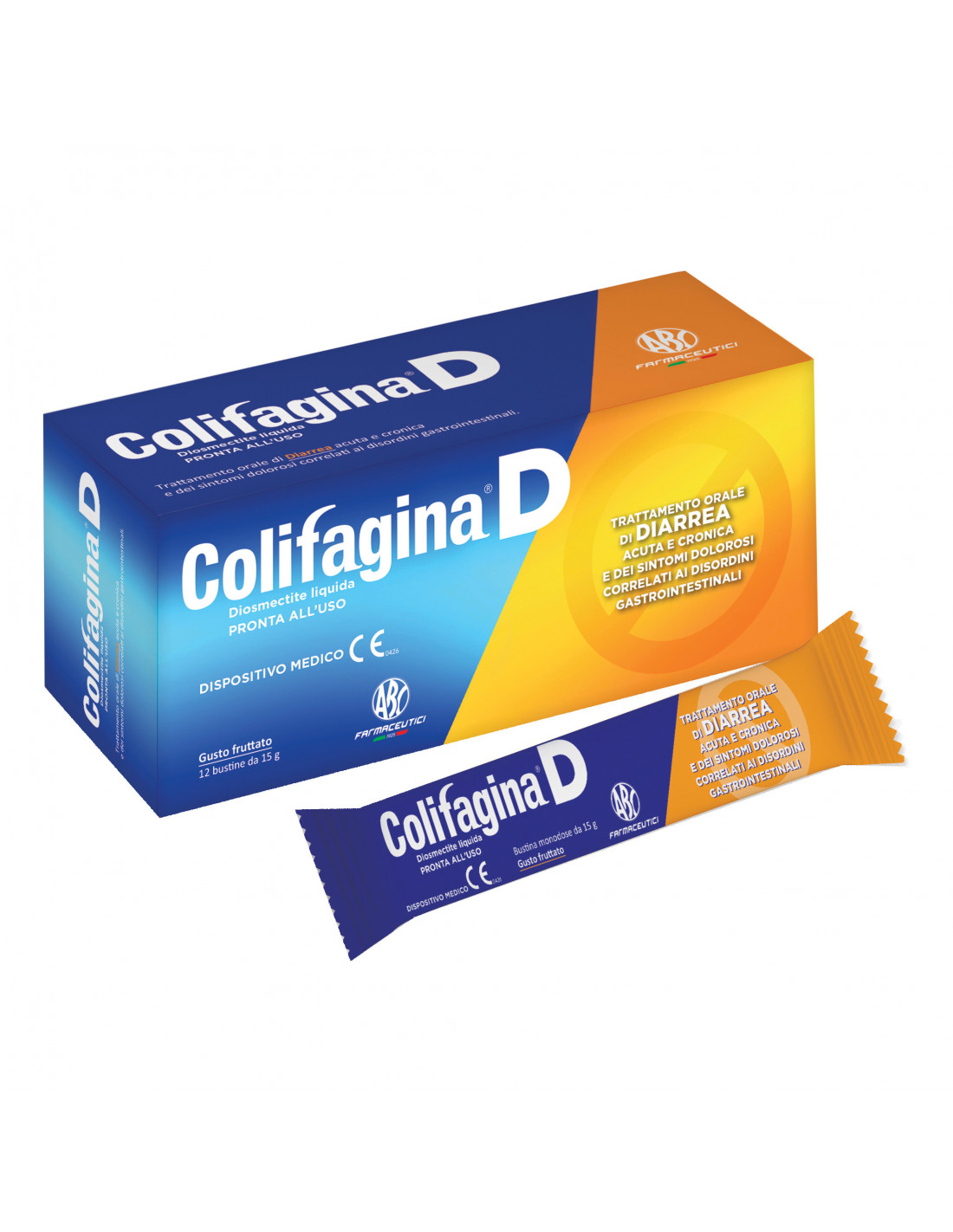 COLIFAGINA D è un dispositivo medico monouso liquido in bustine per via orale. Indicato per il trattamento di diarrea acuta e cronica e i sintomi dolorosi correlati ai disordini gastrointestinali.