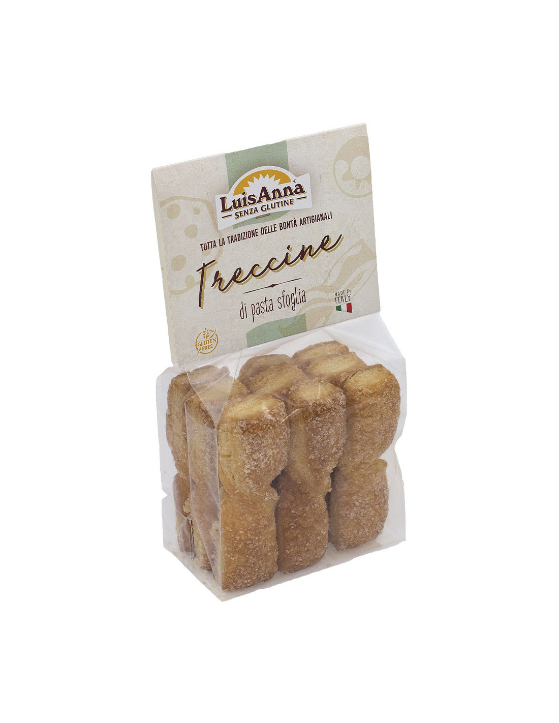 Le Treccine di sfoglie senza glutine LuisAnna sono dei gustosi bastoncini di pasta sfoglia dolce. Uno snack sfizioso creato per una pausa veloce o uno spuntino dal gusto croccante e leggero.