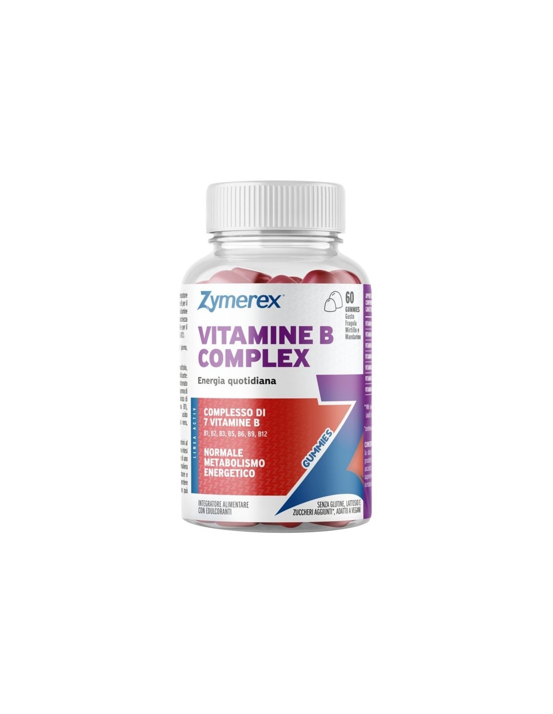 Integratore alimentare a base di un complesso di 7 vitamine B per il supporto del normale metabolismo energetico (vitamine B1,B2,B6,B12,B3,B5,B9), per la riduzione di stanchezza e affaticamento (vitamine B2, B6, B12, B5, B9) e per il sostegno del sistema immunitario (vitamine B6, B12).