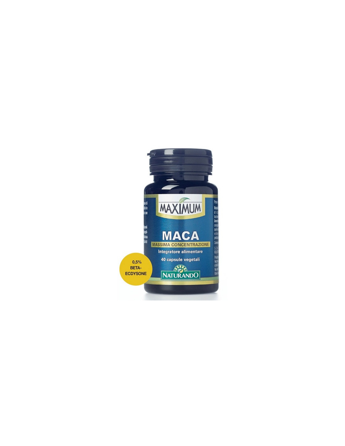 Maca radice estratto secco (Lepidium Meyenii Walp.) titolato allo 0,5% in beta-ecdysone, Idrossipropilmetilcellulosa, Agente di carica: Cellulosa microcristallina; Agente antiagglomerante: Sali di magnesio degli acidi grassi.