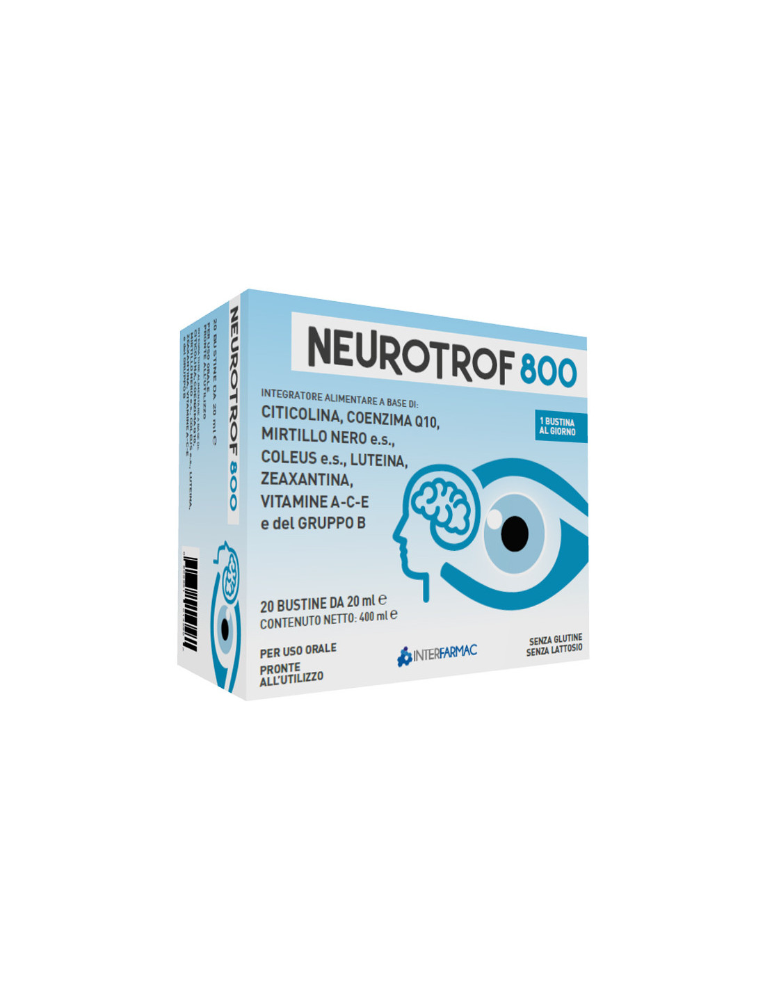 Integratore alimentare con fruttosio a base di citicolina, coenzima Q10, mirtillo nero e.s., coleus e.s., vitamine A, C, E, vitamine del gruppo B (B1, B2, B6, biotina, B12), luteina e zeaxantina, in bustine monodose per uso orale, pronte all'utilizzo.