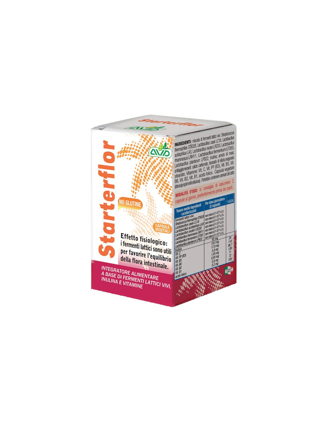 Integratore alimentare a base di fermenti lattici vivi, inulina e vitamine, utile per favorire l'equiilibrio della flora intestinale.