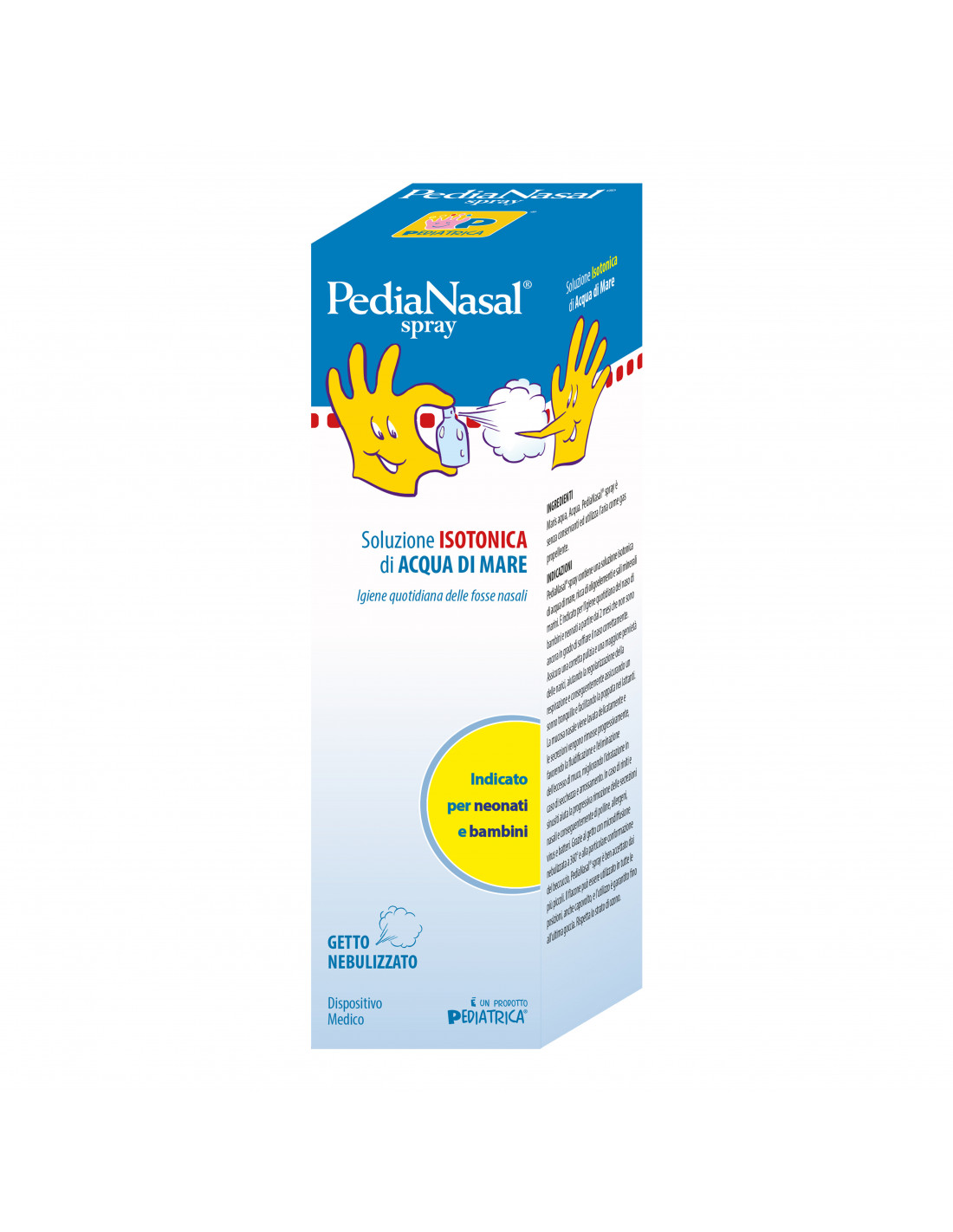 Soluzione isotonica di acqua di mare, ricca di oligoelementi e sali minerali marini. È indicato per l'igiene quotidiana del naso di bambini e neonati a partire dai 2 mesi che non sono ancora in grado di soffiare il naso correttamente. Assicura una corretta pulizia e una maggiore pervietà delle narici, aiutando la regolarizzazione della respirazione e conseguentemente assicurando un sonno tranquillo e facilitando la poppata nei lattanti. La mucosa nasale viene lavata delicatamente e le secrezioni vengono rimosse progressivamente, favorendo la fluidificazione e l'eliminazione dell'eccesso di muco, migliorando l'idratazione in caso di secchezza e arrossamento. In caso di riniti e sinusiti aiuta la progressiva rimozione delle secrezioni nasali e conseguentemente di polline, allergeni, virus, batteri. Grazie al getto con microdiffusione nebulizzata a 360° e alla particolare conformazione del beccuccio, PediaNasal è ben accettato dai più piccoli. Il flacone può essere utilizzato in tutte le posizioni, anche capovolto, e l'utilizzo è garantito fino all'ultima goccia. Rispetta lo strato di ozono.