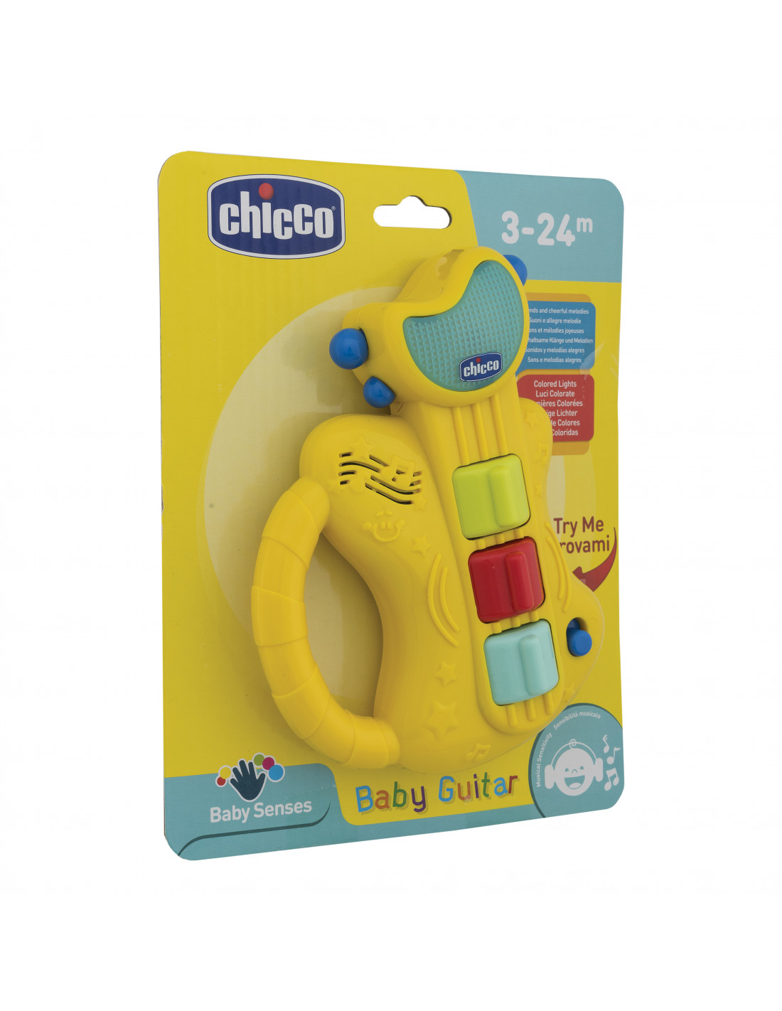 La chitarra Chicco è un un vero e proprio strumento musicale con ben 8 differenti melodie, semplice da impugnare e trasportare anche per i più piccoli, grazie ad una grande maniglia posta sulla parte superiore ed un peso ridotto.