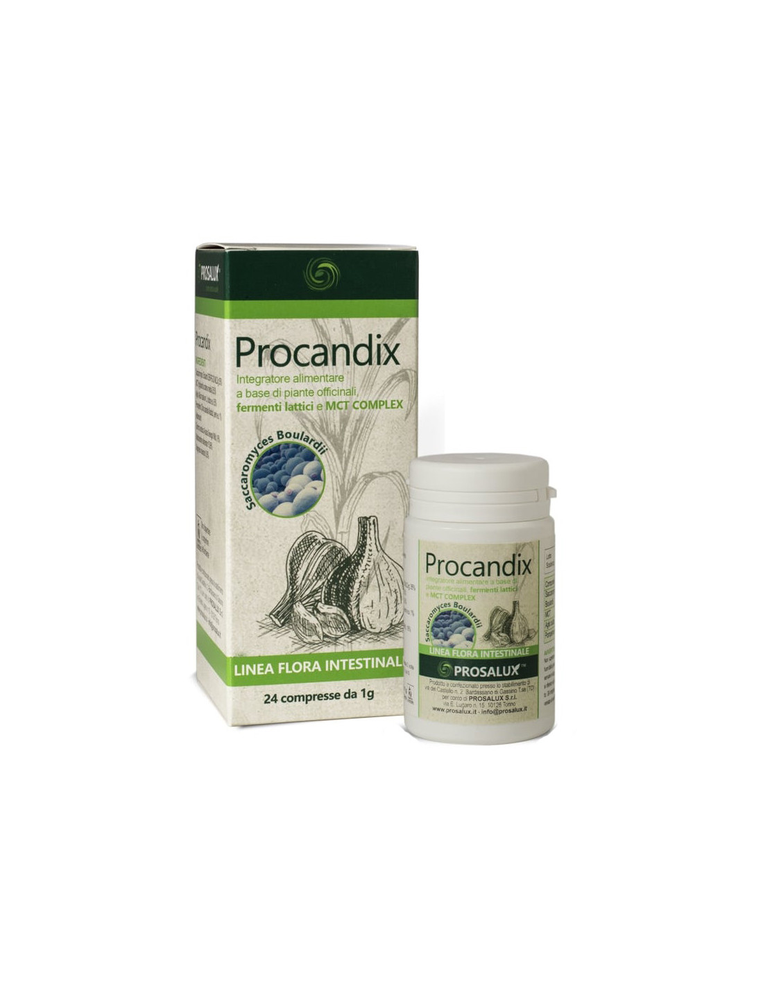 Saccharomyces boulardii DBVPG 20 MLD/g 35%; MCT (trigliceridi a catena media) 25,5%; aglio (Allium sativum L.) bulbo e.s. 6,5%; pompelmo (Citrus paradisi Macfad.) semi e.s. 1%.