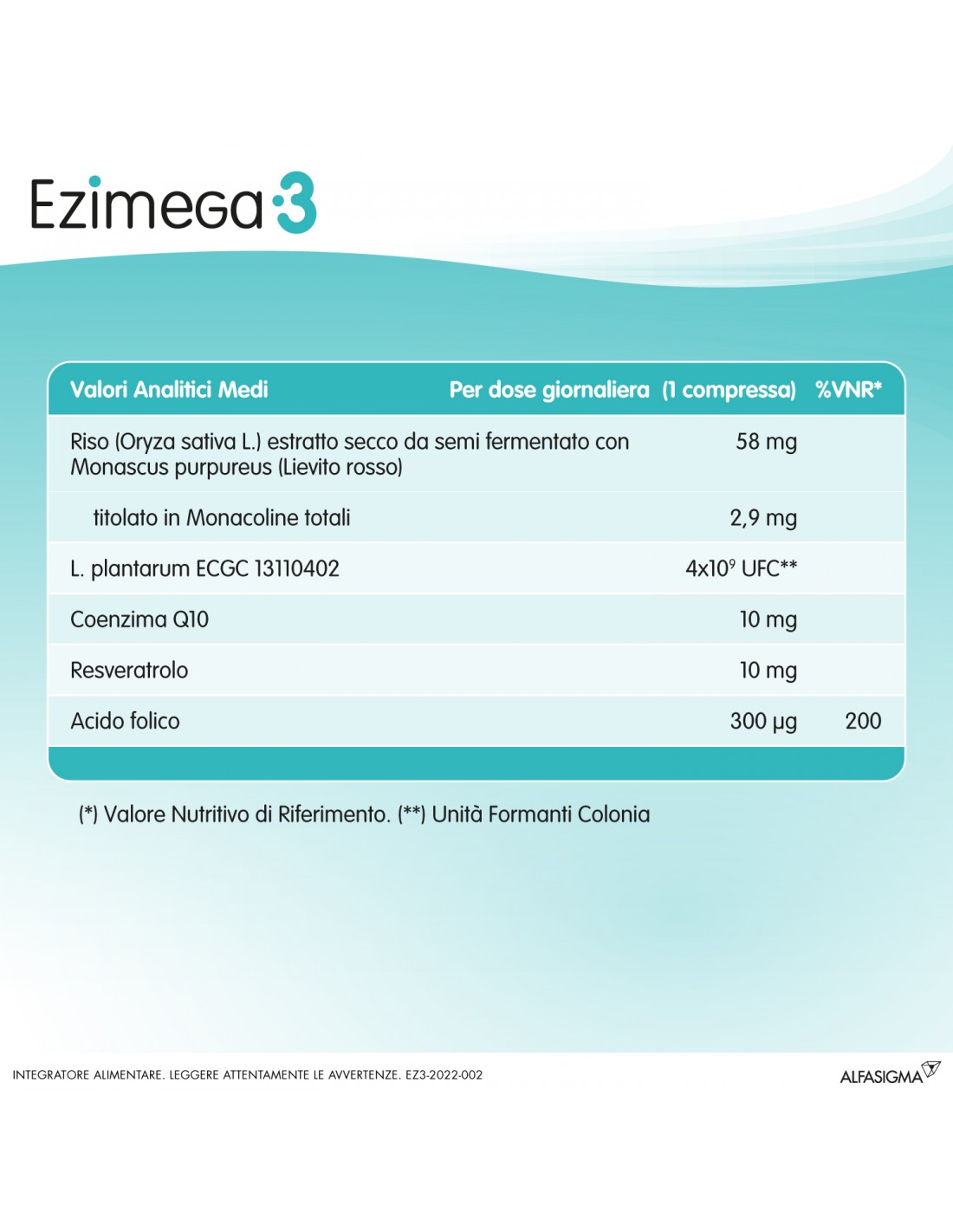 Agenti di carica: cellulosa, fosfato dicalcico, idrossipropilcellulosa, carbossimetilcellulosa sodica reticolata; agente di rivestimento: polivinilpirrolidone; riso rosso fermentato da Monascus purpureus Went (Oryza sativa L., seme) e.s. titolato in monacoline tot., Lactobacillus plantarum (ECGC 13110402)**; agente stabilizzante: mono e digliceridi degli acidi grassi; agenti antiagglomeranti: sali di magnesio degli acidi grassi, biossido di silicio; resveratrolo da Polygonum cuspidatum Siebold&Zucc. radice; coenzima Q10, amido di mais, acido folico (acido pteroil-monoglutammico); colorante: ossidi di ferro e idrossidi di ferro.
