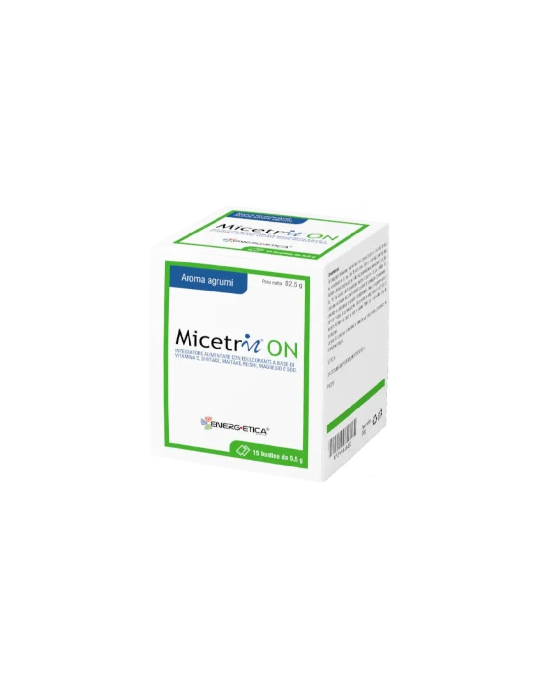 Acido L-ascorbico (vitamina C), bisglicinato di magnesio, shitake [Lentinula edodes (Berk.) Pegler, sporoforo] e.s. tit. 10% in polisaccaridi, reishi [Ganoderma lucidum (Curtis) P., sporoforo] e.s. tit. 10% in polisaccaridi, maitake [Grifola frondosa (Dicks.) Gray, sporoforo] e.s. tit. 30% in polisaccaridi; acidificante: acido citrico; addensante: isomalto; maltodestrina, aromi naturali, superossido-dismutasi da radice di carota; correttore di acidità: carbonato di sodio; edulcorante: sucralosio.