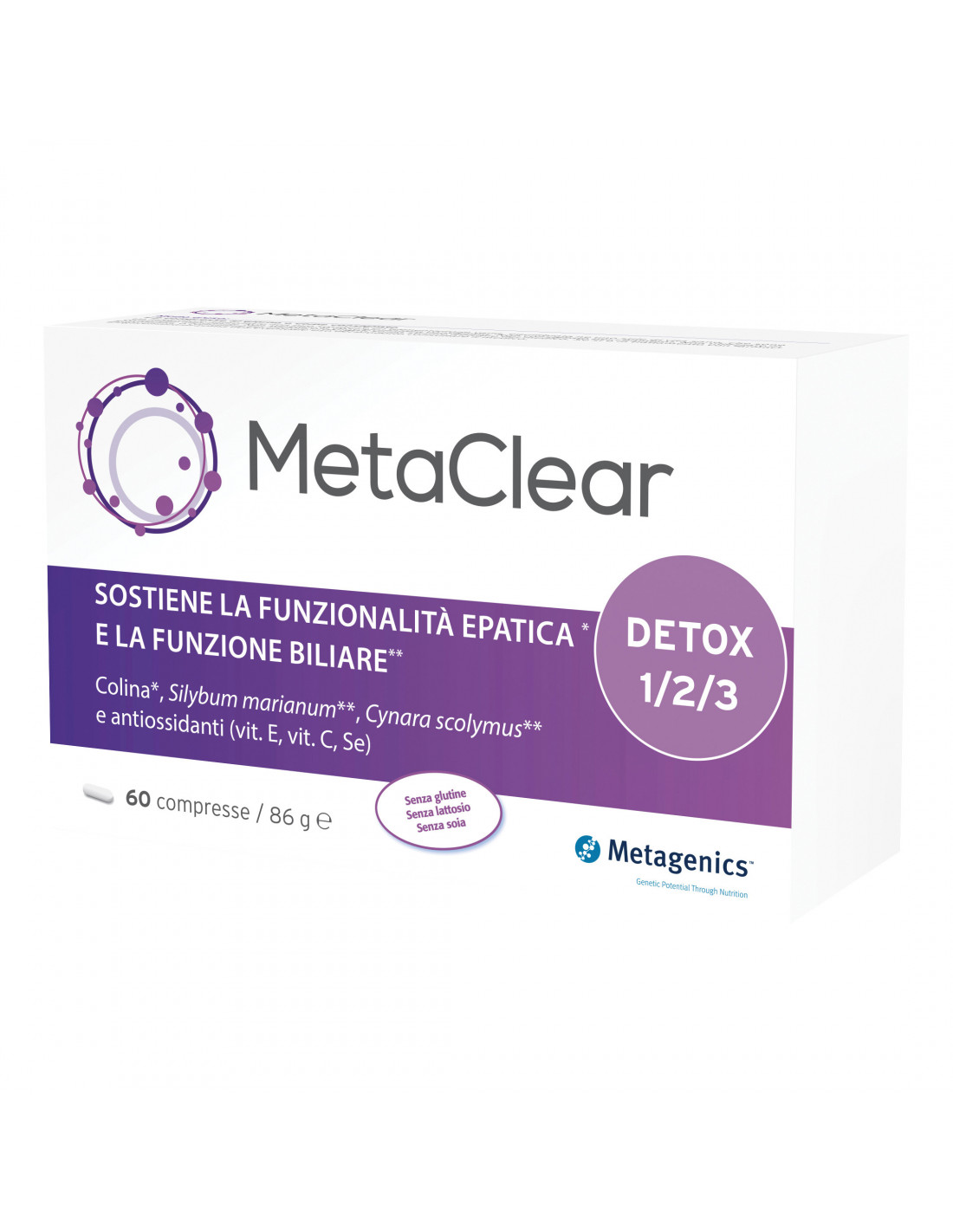 Valori medi per 2 compresse %VNR* Vitamina A 125 mcg 16% Vitamina B1 2,1 mg 191% Vitamina B2 2,4 mg 171% Vitamina B3 12 mg 73% Vitamina B5 9 mg 150% Vitamina B6 3 mg 214% Vitamina B12 25 mcg 1.000% Vitamina C 67 mg 83% Vitamina D 25 mcg 500% Vitamina E 17 mg 142% Biotina 33 mcg 67% Folato (Metafolin) 134 mcg 67% Rame 0,33 mg 33% Manganese 0,83 mg 42% Molibdeno 33 mcg 67% Selenio 25 mcg 45% Zinco 3,3 mg 33% Citrato di potassio 254 mg Solfato di sodio 50 mg Taurina 100 mg Colina 83 mg N-acetil-cisteina 150 mg Estratto di tè verde 50 mg Estratto di carciofo 75 mg Estratto di crescione 100 mg Estratto di melograno 100 mg Estratto di cardo mariano 200 mg L-cisteina HCl 5 mg L-glutatione ridotto 10 mg L-treonina 35 mg L-lisina HCl 35 mg L-glicina 400 mg