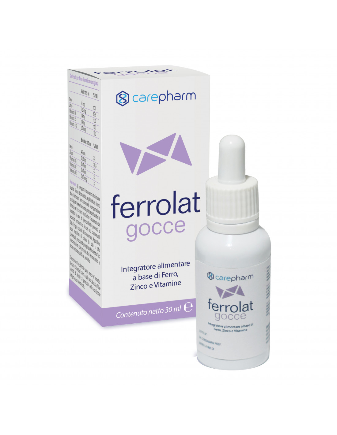 Integratore alimentare a base di ferro, zinco e vitamine. Il ferro e la vitamina B12 contribuiscono alla normale formazione dei globuli rossi e, insieme allo zinco, aiutano il normale funzionamento del sistema immunitario. Le vitamine del gruppo B favoriscono il normale funzionamento del sistema nervoso. Il complesso vitaminico e il ferro presenti in Ferrolat Gocce contribuiscono alla riduzione della stanchezza e dell'affaticamento. Lo zinco protegge le cellule dallo stress ossidativo e contribuisce alla normale funzione cognitiva.