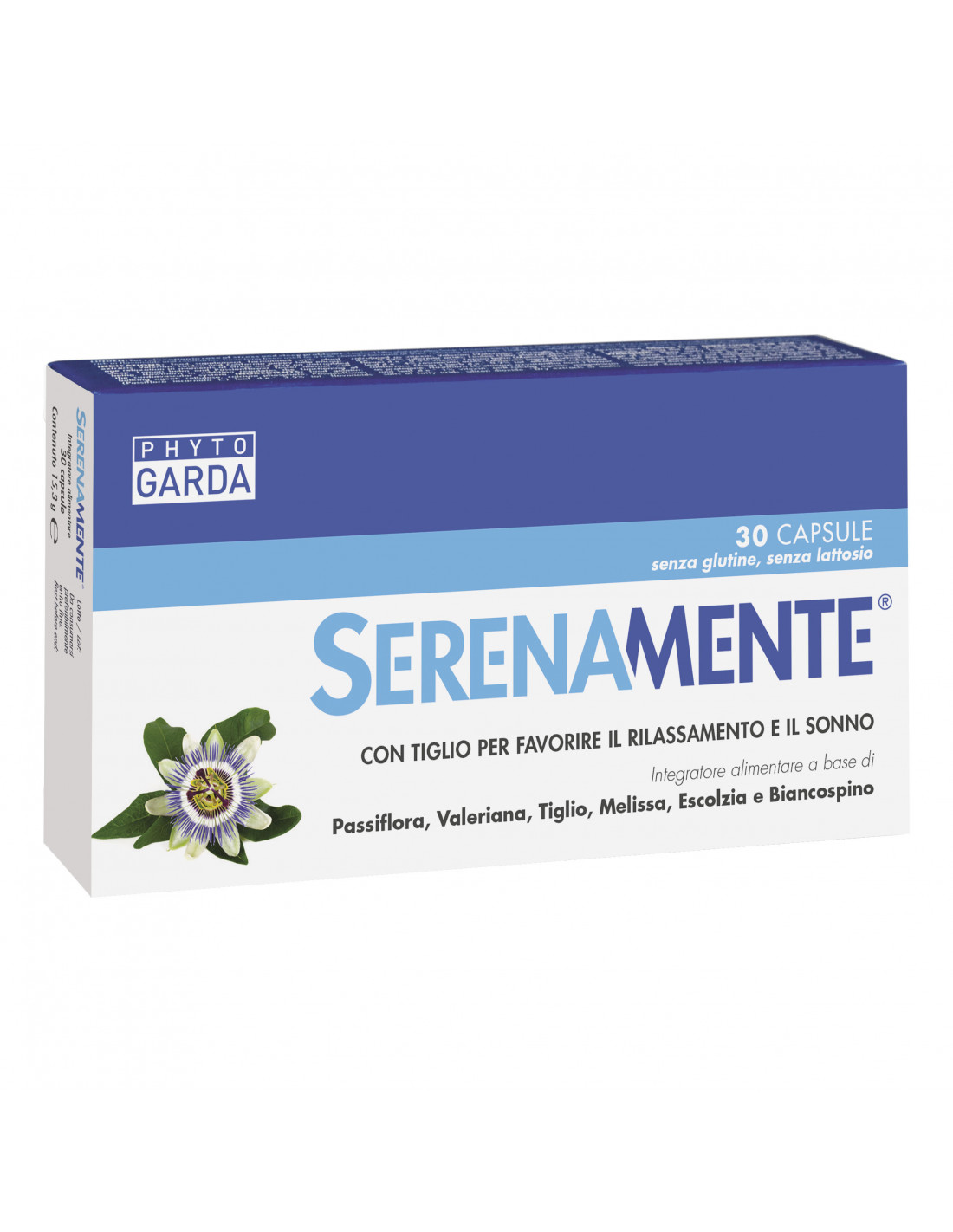Capsula di gelatina alimentare, passiflora (Passiflora incarnata L.) parte aerea estratto secco tit. 3,5% flavonoidi totali, valeriana (Valeriana officinalis L.) radice estratto secco tit. 0,4% acidi valerenici, tiglio (Tilia platyphyllos Scop.) fiore estratto secco tit. 0,5% flavonoidi totali calcolati come vitexina, melissa (Melissa officinalis L.) foglia estratto secco tit. 4% derivati idrossicinnamici totali calcolati come acido rosmarinico; agenti di carica: cellulosa, fosfato dicalcico; escolzia (Eschscholzia californica Cham., maltodestrina) parte aerea estratto secco tit. 0,2% alcaloidi totali calcolati come protopina, biancospino (Crataegus oxycantha auct.) fiore e foglia estratto secco tit. 1% flavonoidi totali calcolati come vitexina; agenti antiagglomeranti: sali di magnesio degli acidi grassi, biossido di silicio.