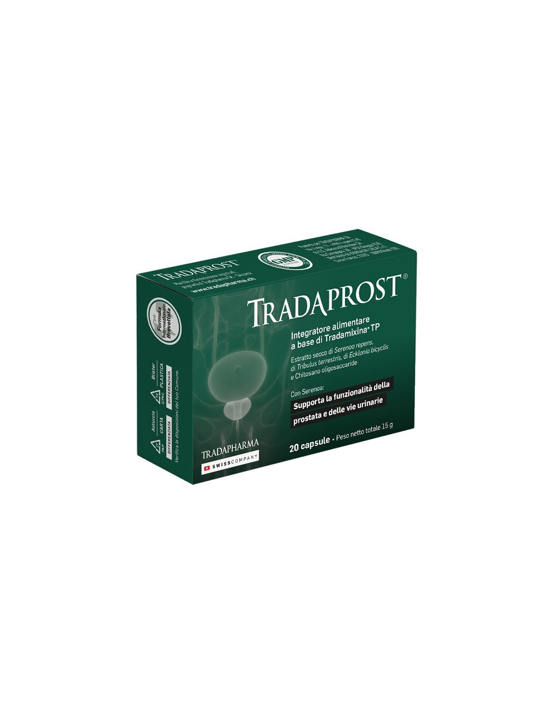 TRADAPROST Integratore alimentare a base di estratto purificato di alga ecklonia bicyclis, tribulus terrestris, biovis, serenoa repens. Favorisce la funzionalità della Prostata la composizione si articola su 4 componenti strategici ben dosati tra loro.