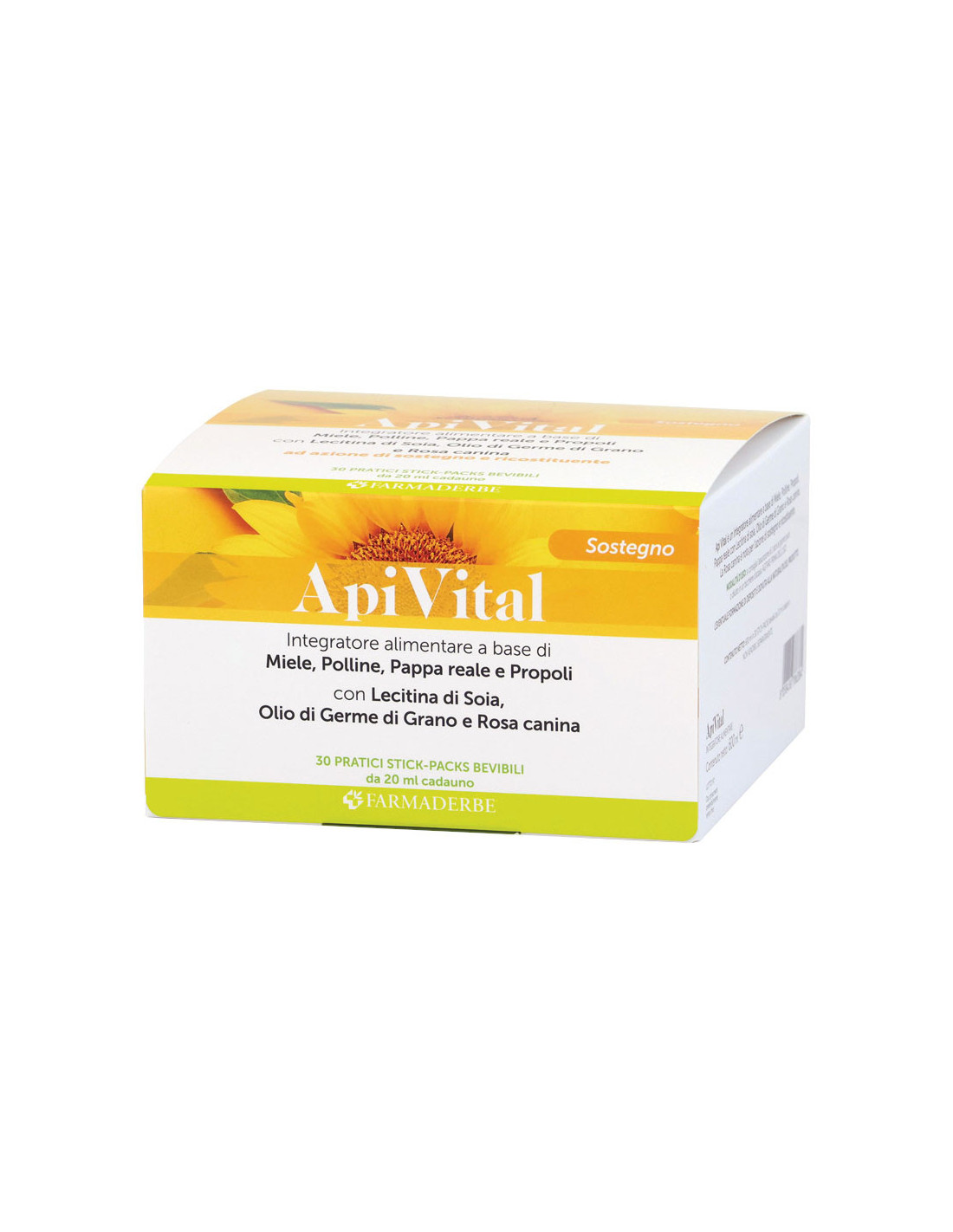 Valori medi per 1 stick Miele 15 g Polline 830 mg Propoli e.s. 210 mg Pappa reale liofilizzata 240 mg Lecitina di soia 100 mg Olio di germe di grano 100 mg Rosa canina e.s. 100 mg