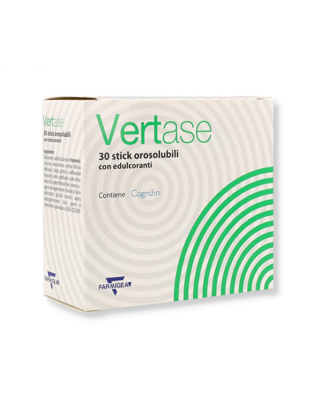 Edulcorante: sorbitolo (da mais o frumento); citicolina, maltodestrine, melissa (Melissa o fficinalis L.) foglie, gambi e.s., biofl avonoidi da agrumi, aromi; acidifi cante: acido citrico; zenzero (Zingiber o fficinale Rosc.) rizoma e.s.; agente antiagglomerante: biossido di silicio; edulcorante: glicosidi steviolici da stevia; agente antiagglomerante: talco; agente di rivestimento: gommalacca.