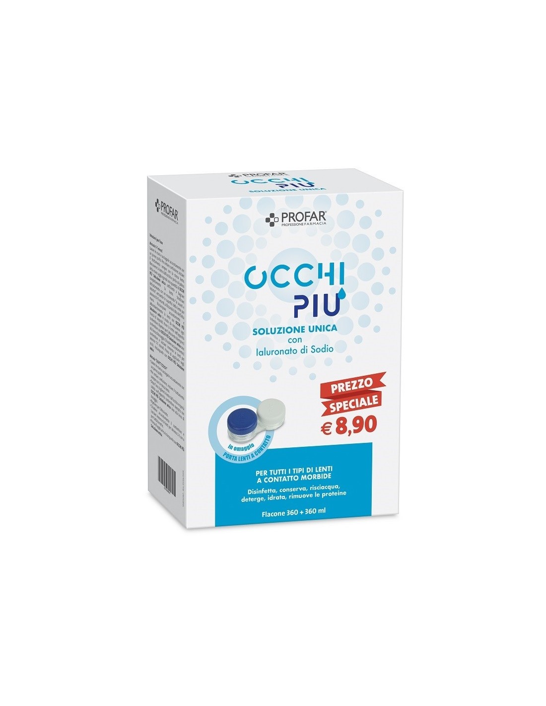 OCCHI PIÙ Soluzione unica con Ialuronato di Sodio è una soluzione per la disinfezione, la conservazione, la detersione, il risciacquo, l’idratazione di tutte le lenti a contatto morbide. Rimuove le proteine, adatto anche per occhi sensibili. Attiva in 5-7 minuti.