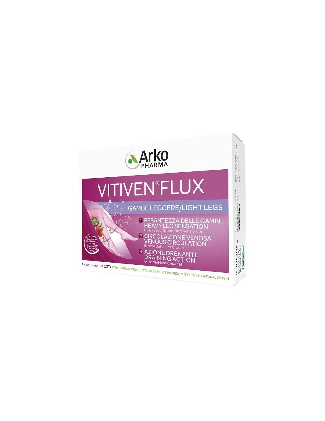 Integratore alimentare a base di piante e di vitamina B2. Vitiven Flux contribuisce a migliorare il benessere della circolazione venosa (Rusco). L'uva e il rusco (o pungitopo) favoriscono la funzionalità del microcircolo dando sollievo in caso di gambe pesanti. L'uva ha un'azione antiossidante. L'olmaria favorisce il drenaggio dei liquidi corporei. La vitamina B2 contribuisce alla protezione delle cellule contro lo stress ossidativo.