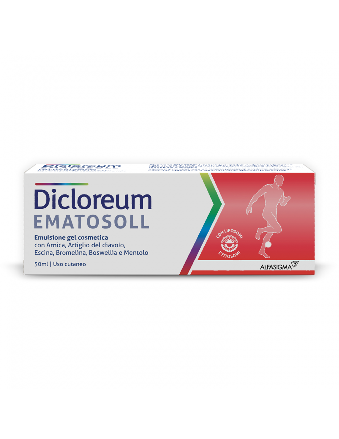 Gel cosmetico con arnica, artiglio del diavolo, escina, bromelina, Boswellia e mentolo, studiato per favorire il benessere della pelle. In particolare, svolge un'azione lenitiva e agisce per mantenere le normali condizioni cutanee in caso di contrasti imprevisti che possono capitare durante le attività della vita quotidiana o sportiva. Dona un'immediata e prolungata sensazione di freschezza. Dicloreum Ematosoll gel è una formulazione innovativa in quanto alcune delle sostanze funzionali sono formulate in liposomi (bromelina) e fitosomi (escina e boswellia), che ne favoriscono l'efficacia e la permanenza a livello cutaneo. Si assorbe rapidamente, senza ungere.