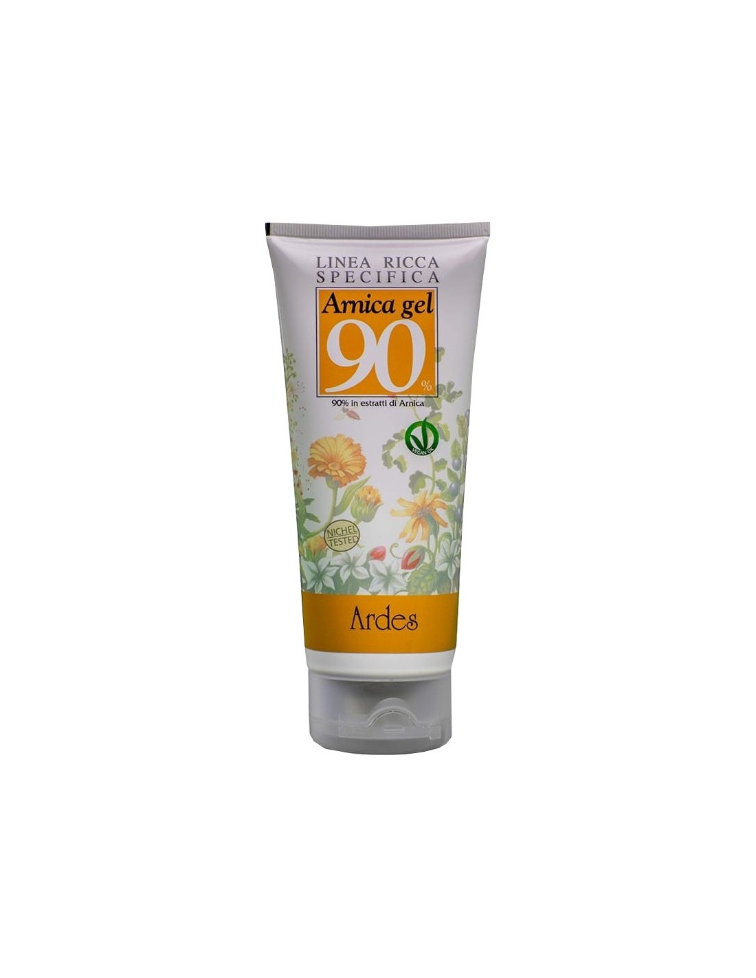 Gel per massaggio locale con elevatissima concentrazione di arnica (estratto glicerico e acqua aromatica: totale 90%). Con preservanti accettati da disciplinari naturali o Bio.